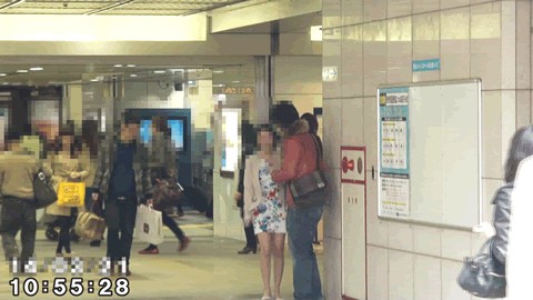 ![]() (女性Aに触れられ、驚いた様子の対象者) ![]() (女性Aに気づき、笑顔になる対象者) |
