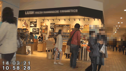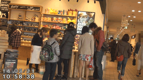 ![]() (「※※※※」前で立ち止まる二人) ![]() (入浴材「※※※※※※※※」を手に取る) ![]() (左右の店舗を見ながら施設内を歩く二人) |
