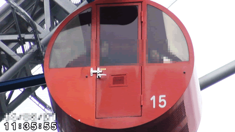 ![]() (ゴンドラ内より外を眺めながら談笑する二人) ![]() (一周回って戻てくる二人の乗車したゴンドラ) |