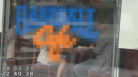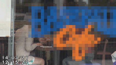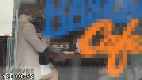 店内での撮影は原則不可能行いません。幸いにも窓側の席についたため、店外で待機している調査員が外からの撮影に成功しています。