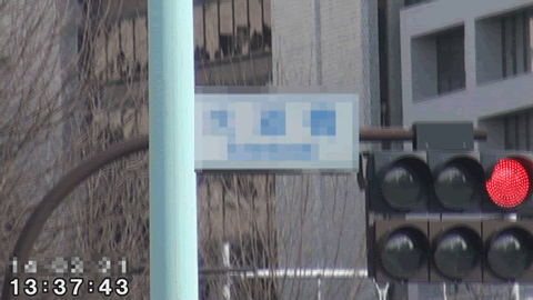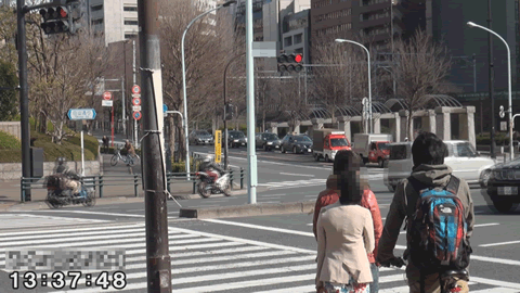 ![]() (「※※※交差点」案内表示) ![]() (「※※※交差点」でタクシーを待つ二人) |