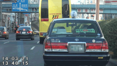 前方ほ走るタクシーと車内の様子を撮影しながら、現在地や進行方向が分かるように、交差点名や案内表示を同じ映像に収めます。