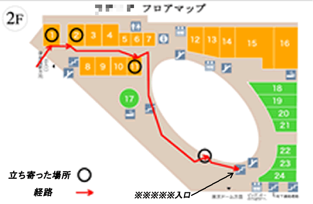 対象者の動きがより具体的に分かるように、施設のフロアマップや案内図を使い、経路や立ち寄った場所等を記します。