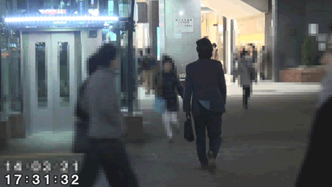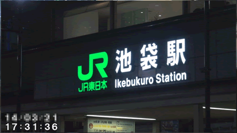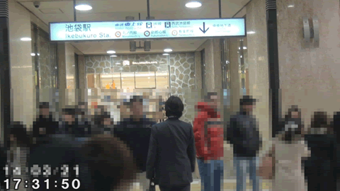 ![]() (「JR池袋西口前を歩く対象者) ![]() (「JR池袋駅西口」表示) ![]() (「JR池袋駅西口」より地下に向かう対象者) |