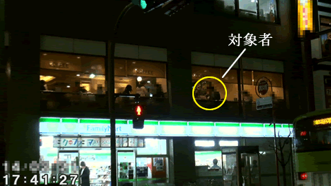 ![]() (「※※※※」の所在地) ![]() (窓際のボックス席に座る対象者) ![]() (店名表記) |