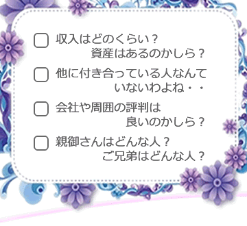 本人ばかりでなく親御様にしても、大切なお子様の結婚ともなれば、その相手の方やご家族はどのような人なのか?
